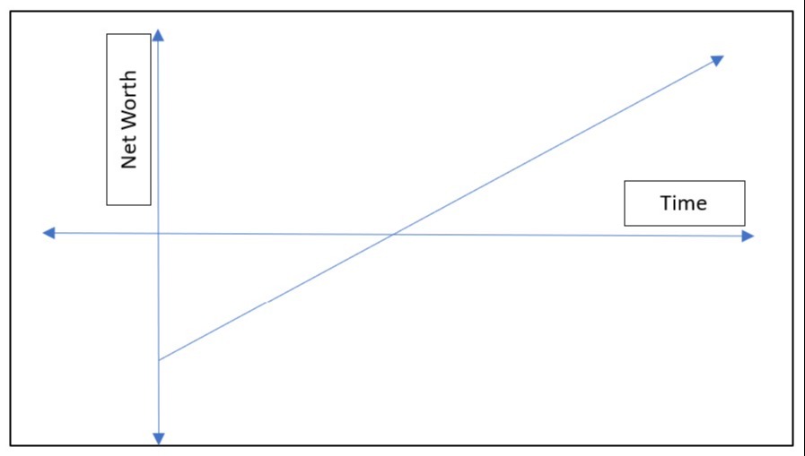 The chart below shows a typical journey of someone leaving college with loans and a negative net worth. Once this person begins their career, they typically earn more and more each year. Eventually they hit a point where they are more easily able to pay off debts and start to build a positive net worth.