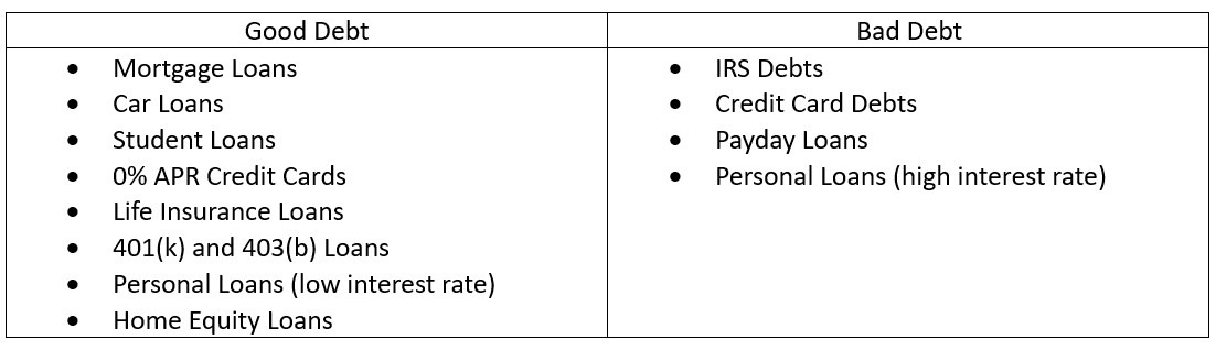 Start by identifying who you owe. If the answer is the IRS, then this is instantly a Bad Debt. The IRS is not a lenient lender and can seize assets such as wages, bank accounts, Social Security benefits, and retirement income. The IRS also may seize your property (including your car, boat, or real estate) and sell the property to satisfy the tax debt. If instead, you owe a financial institution, the terms of the loan will determine if you have a “good” or “bad” debt.